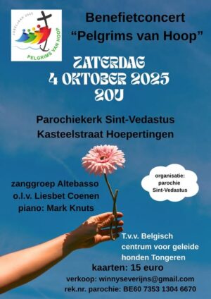Op zaterdag 4 oktober 2025 nodigen wij jullie van harte uit voor het benefietconcert Pelgrims van Hoop. Samen met onze dirigent Liesbet Coenen en pianist Mark Knuts brengen wij met zanggroep Altebasso een avond vol muziek die mensen samenbrengt en verwarmt. Het wordt een bijzonder concert waarin we niet alleen onze passie voor zingen delen, maar ook ons steentje bijdragen aan een mooi doel. De opbrengst gaat namelijk naar het Belgisch centrum voor geleide honden, een organisatie die een wereld van verschil maakt voor mensen die op hun trouwe viervoeter kunnen rekenen. We hopen jullie die avond te mogen verwelkomen om samen van de muziek te genieten en dit mooie initiatief te ondersteunen.